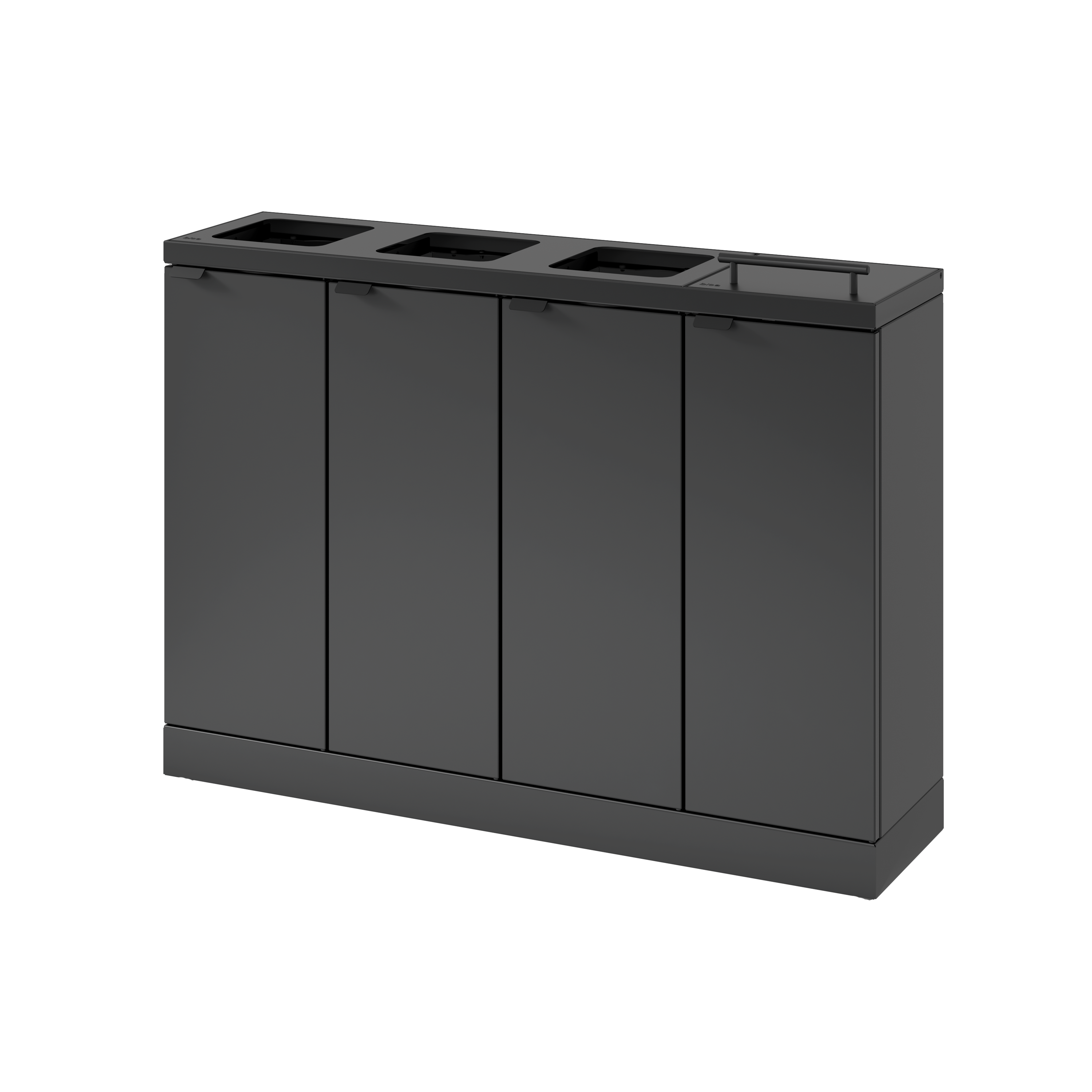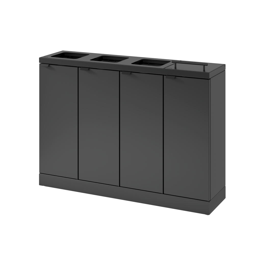 Fleksibelt affaldssystem fra Bica sikrer nem og brugervenlig affaldssortering på arbejdspladsen. Affaldssystemet er designet med 4 fraktioner med henholdsvis 3 åbne indkast og 1 med løftelåg. Løftelåg har gasdæmper for lydløs lukning. Formålet med låget er at minimere lugtgener og forhindre bananfluer ved sortering af madaffald. En rigtig smart løsning, hvis posen ikke tømmes så ofte.