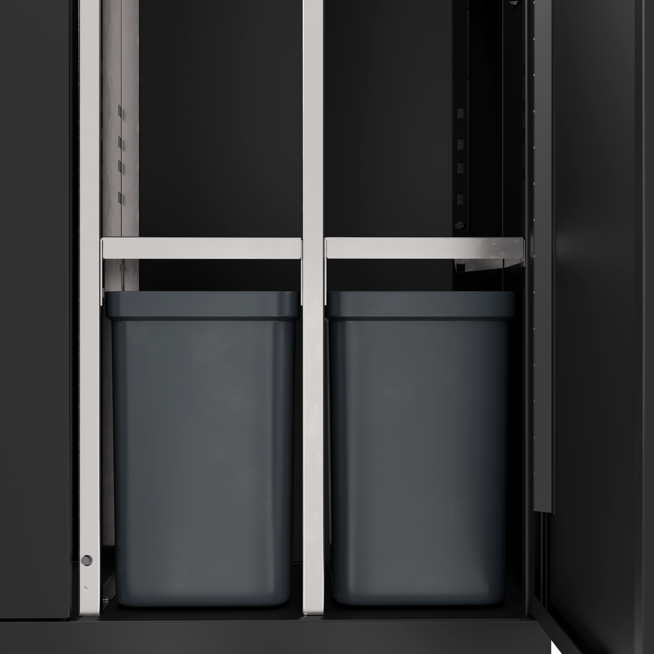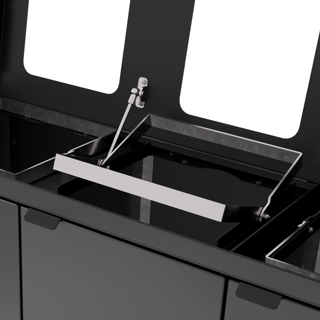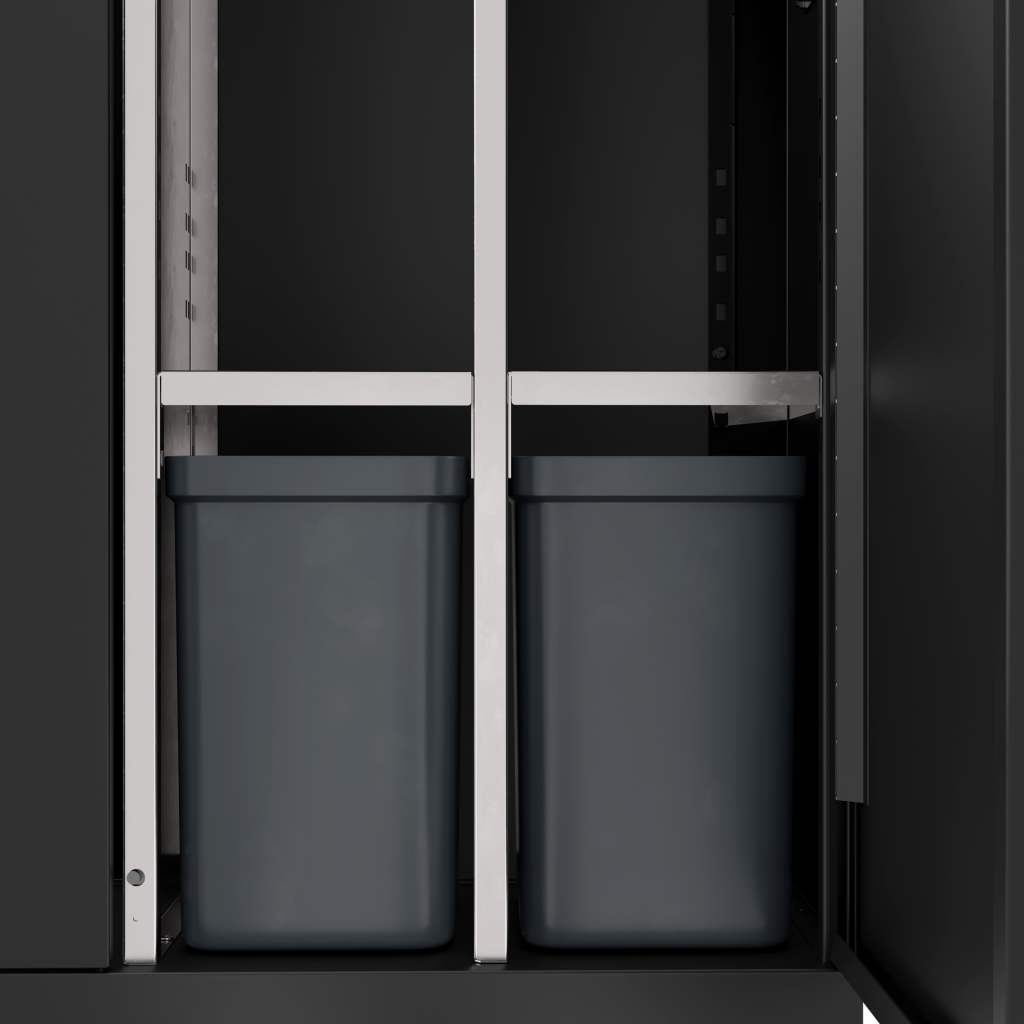 Affaldssystemet er udstyret med frontdøre med soft close for ergonomisk korrekt tømning uden tunge løft. Affaldssystemet er udstyret med integrerede og stærke poseholdere, så posen bliver siddende. Der er monteret gasdæmper i låget for lydløs og rolig lukning, og låget skjuler samtidig poserne, så affaldssystemet bevarer et stilrent design. Affaldssystemet er flytbart takket være de monterede hjul, som er skjult bag soklen. Affaldsløsningen leveres med et magnetisk vægbeslag, som den skal fikseres til.