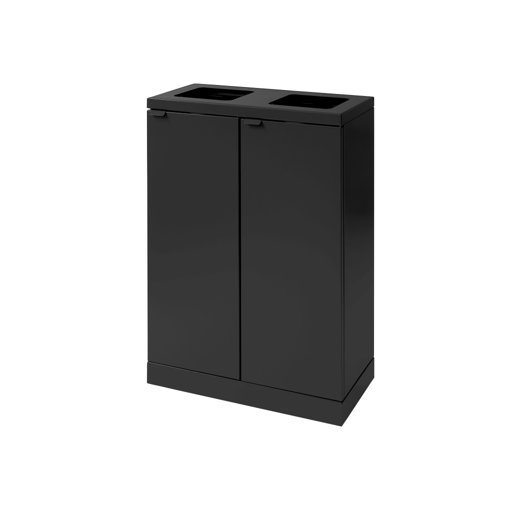 Fleksibelt affaldssystem fra Bica sikrer nem og brugervenlig affaldssortering på arbejdspladsen. Affaldssystemet er designet med 2 fraktioner med åbne indkast.
