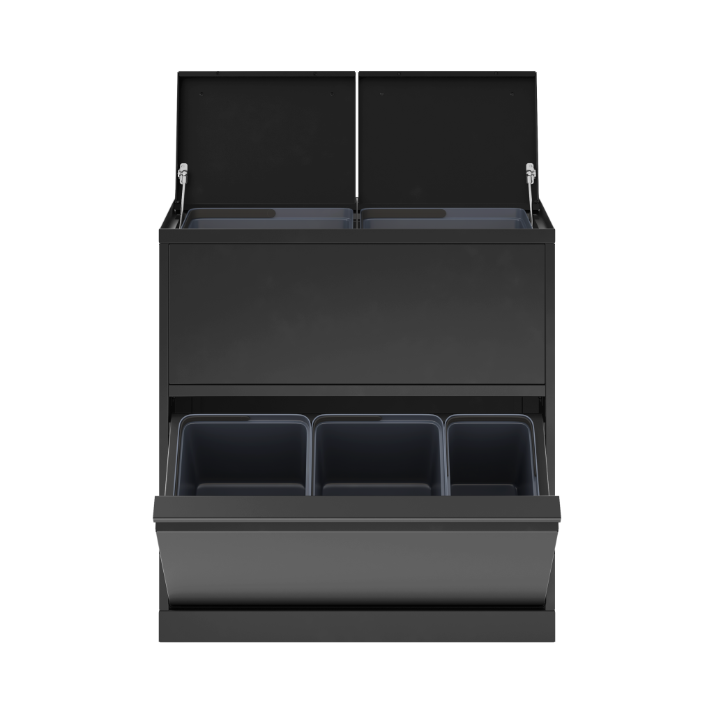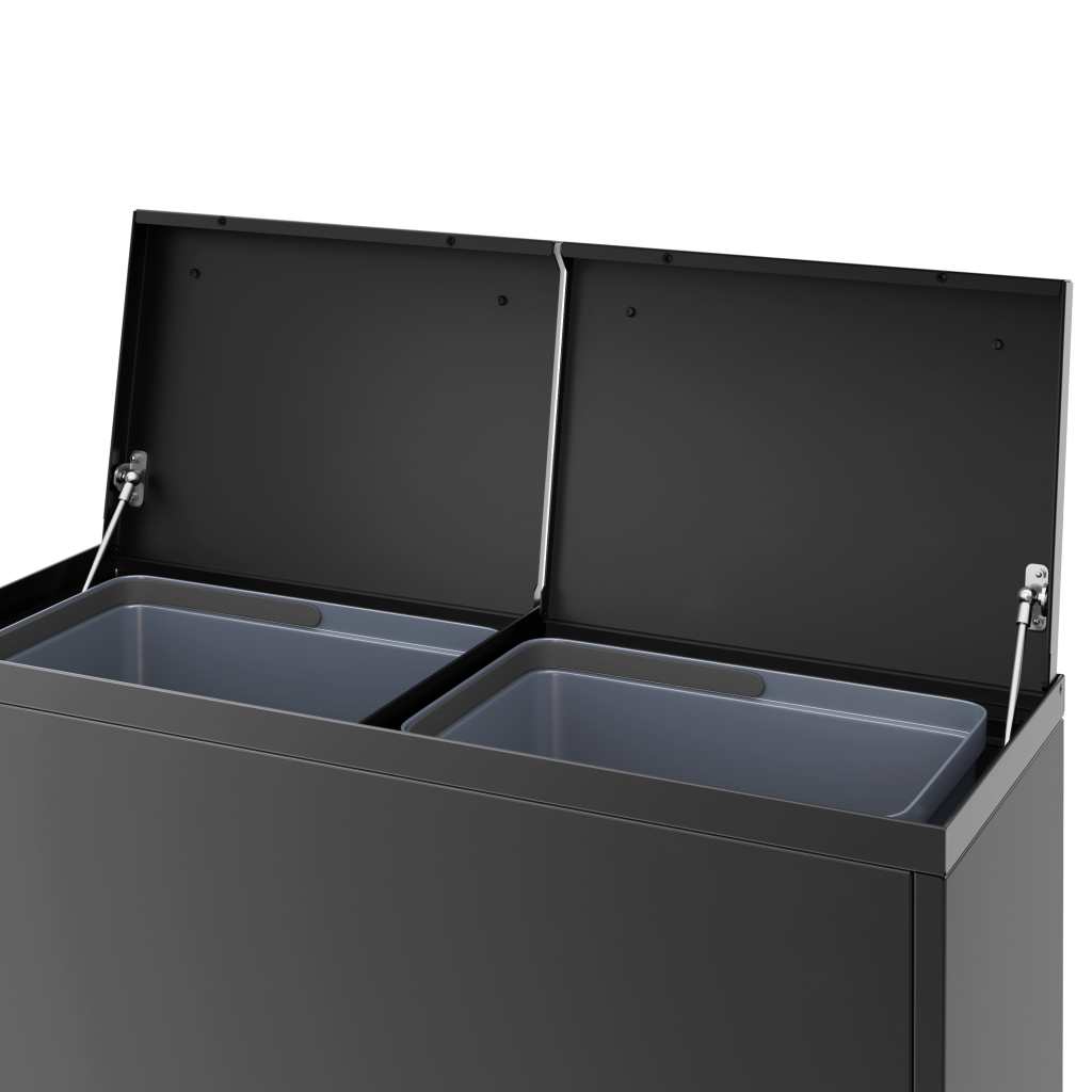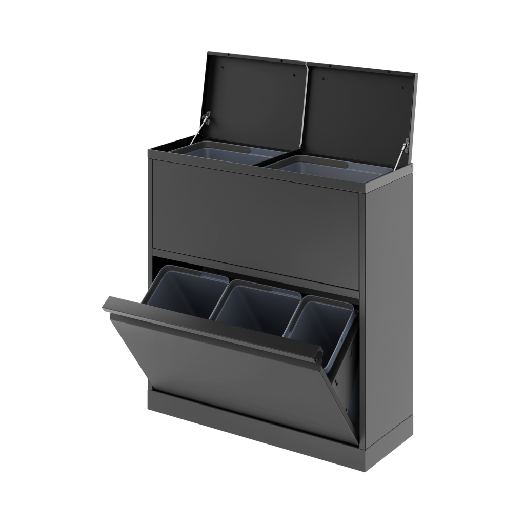 Fleksibelt affaldssystem fra Bica sikrer nem og brugervenlig affaldssortering på arbejdspladsen. Affaldssystemet er designet med 2 indkast med låg og en skuffe – skabt til brug af til inderbeholdere. Der medfølger inderbeholdere efter ønske og kan dermed tilpasses efter behov, så man i alt kan opnå sortering i 11 enheder. Den samlede volumen skal blot gå op i 40 liter i både den øverste og nederste del. Fx 20 + 20 liter eller 15 + 15 + 10 liter. Formålet med lågene er at minimere lugtgener og forhindre bananfluer ved sortering af madaffald. Bica Model 881 er absolut én af vores mest populære modeller.
