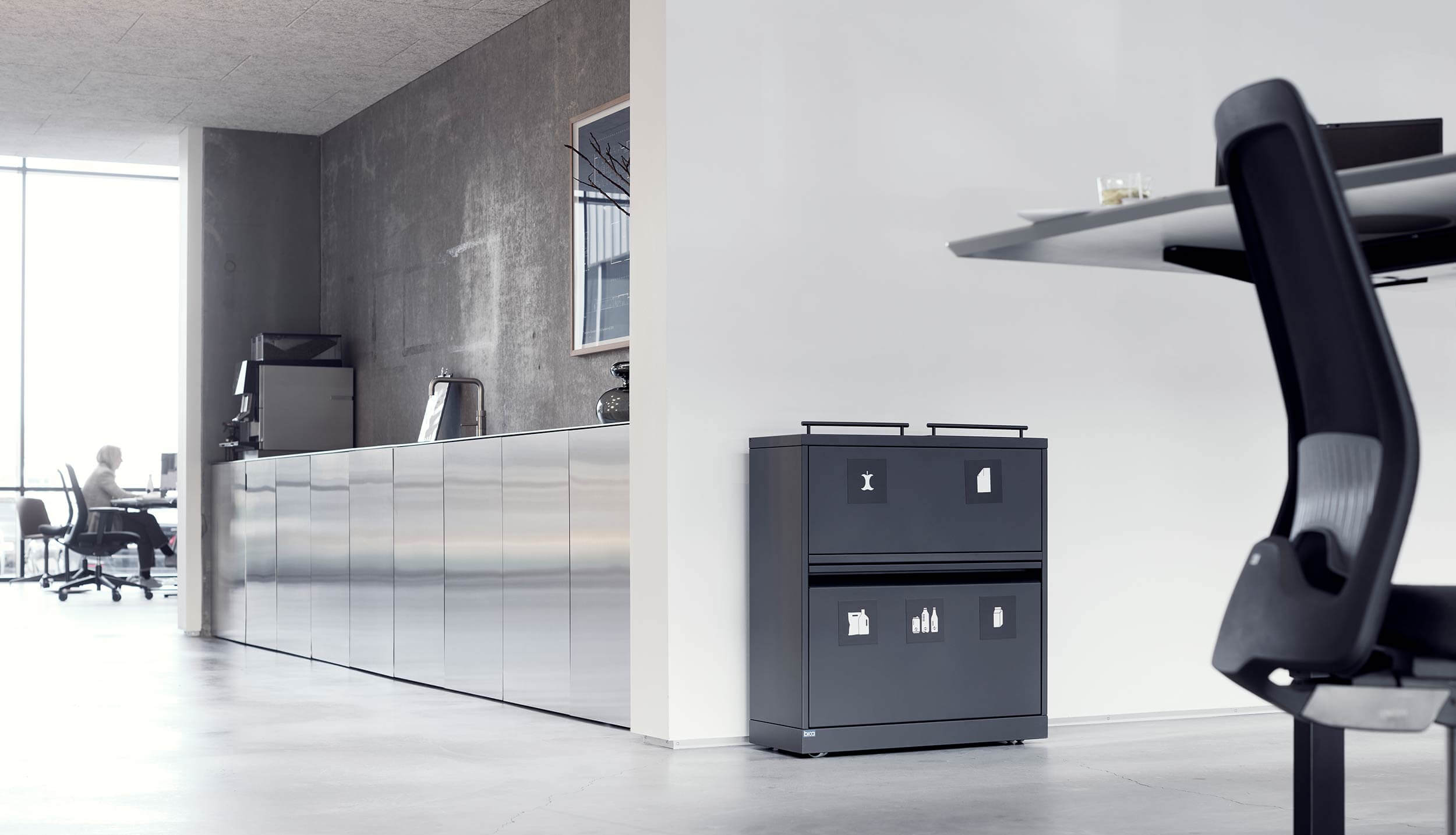 Sagt på en anden måde: Har du 20 medarbejdere samlet i et åbent kontormiljø, skal affaldsstationen placeres maks. 20 meter fra deres plads. Ellers risikerer du, at medarbejderne ikke vil anvende løsningen korrekt. De skal ændre adfærd fra at smide sit papir i en papirskurv lige under skrivebordet, til at man skal rejse sig og gå lidt for at komme af med det. Derfor bruger vi 20/20-reglen som anbefaling til vores kunder. Så kommer du godt i mål med affaldssorteringen.